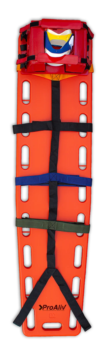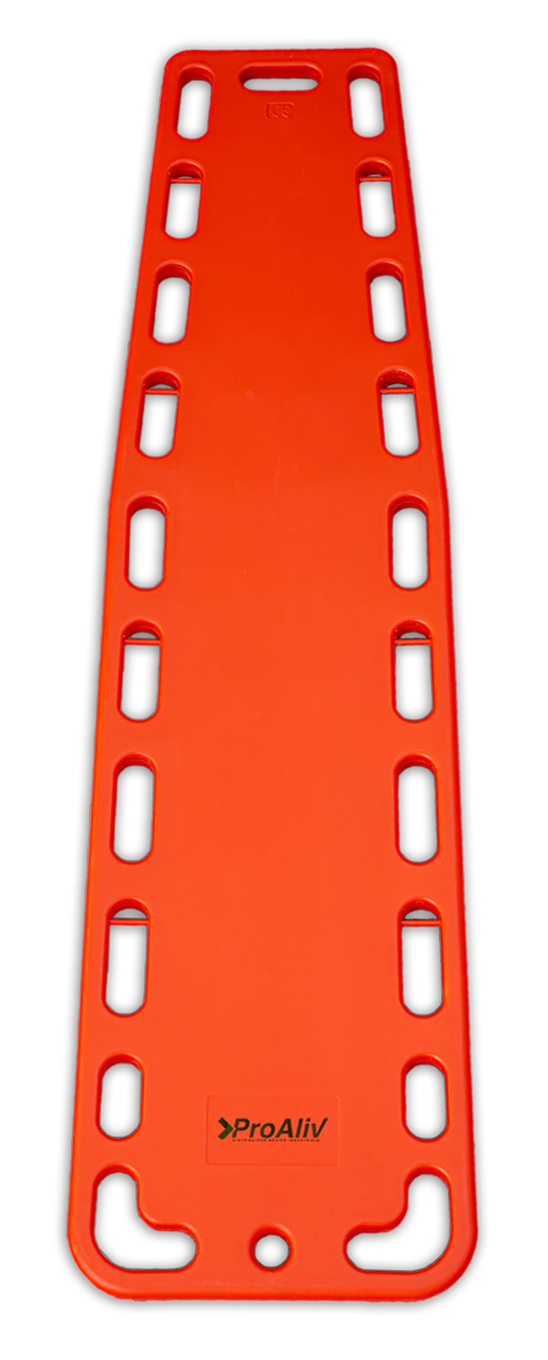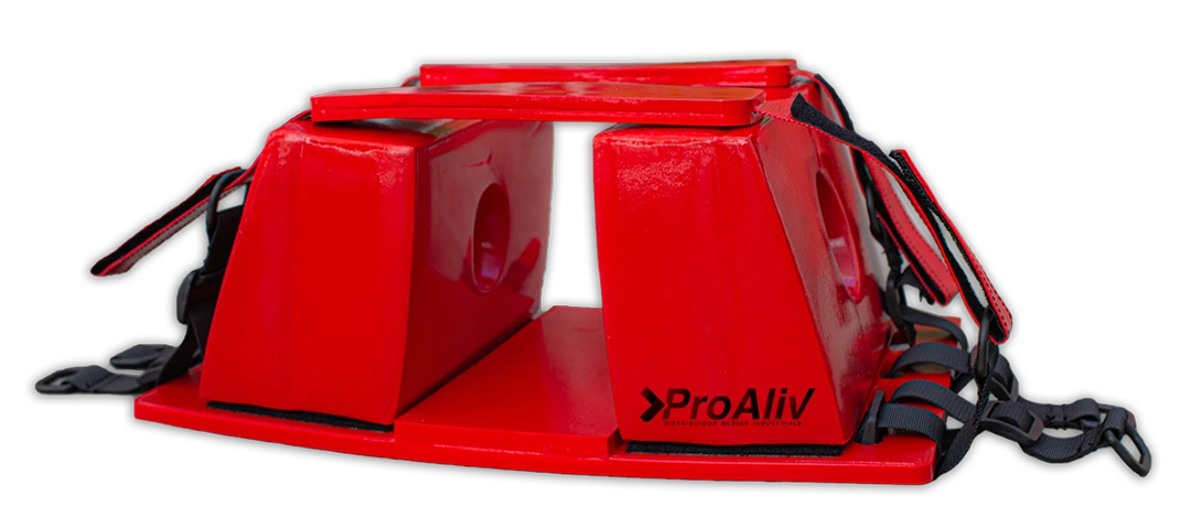 Camilla larga con capacidad de flotación. Traslucida a rayos X no absorbe fluido corporales. Diseño elavado para fácil levantamiento. 20 puntos de agarres grandes y 8 agarres medianos para correcto anclaje de inmovilizador de cuerpo completo e inmovilizador de cráneo.